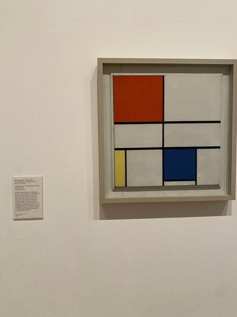 解説を読んでみると、「赤・黄・青の三原色は控えめに使われている。こうした要素の構造とグリッド(格子)によって、モンドリアンは動的なバランスを実現した。モンドリアンは、作品を構成するそれぞれの要素が「個人」と「全体(社会)」の関係を象徴するものだと考えていた。」と書いてたんだが、まあさっぱり意味がわからない。