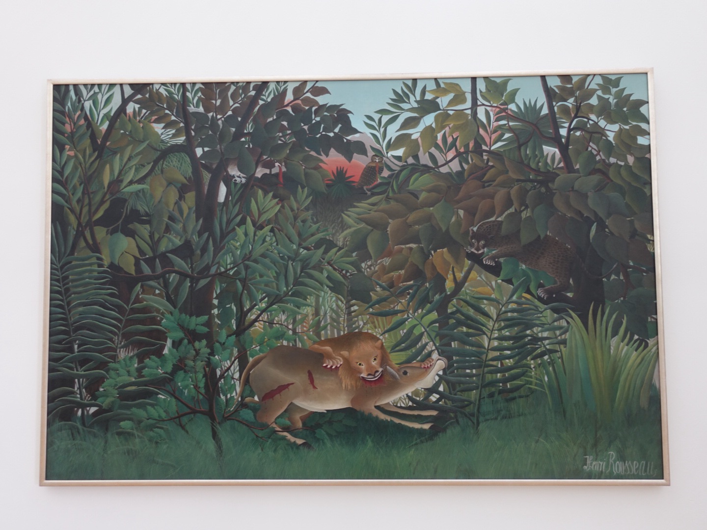 最初の感想としては、とにかくかわいい!本来はグロいはずのシーンなんだけど、正直この絵はかわいい。ルソーの絵に度々登場するこのジャングルみたいな緑も良い。