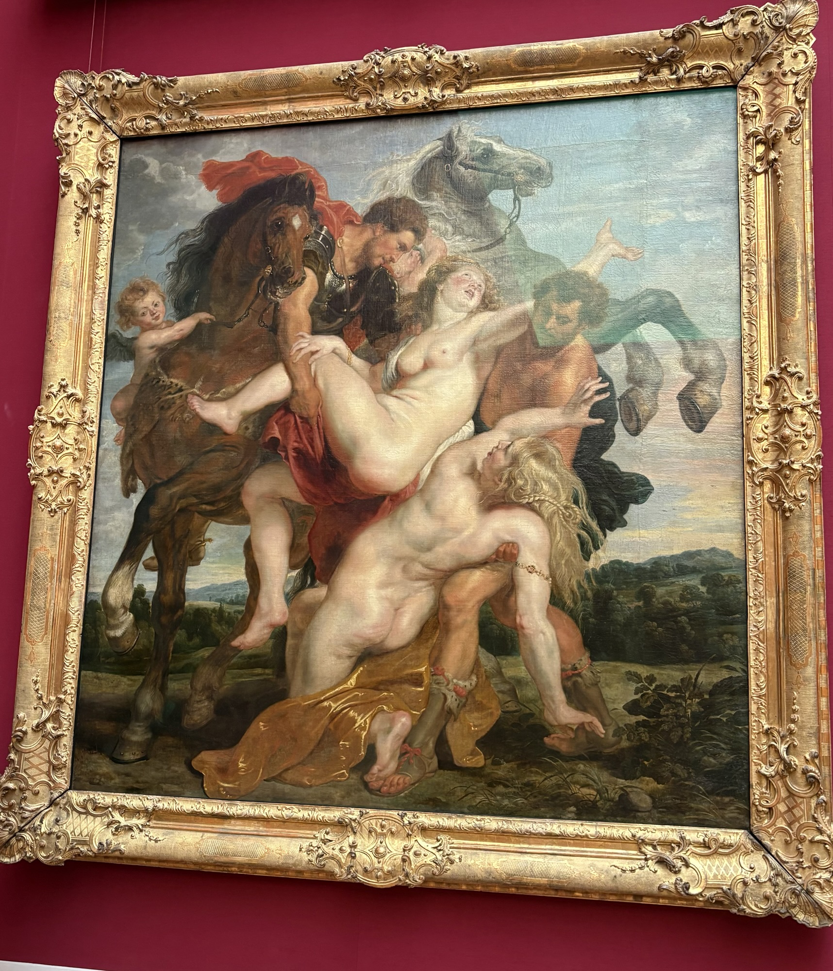 勝手に聖書の中の話だと思ってたけど、これはギリシャ神話の中の一場面。ギリシャ神話の主神ゼウスと人間の王妃レダとの間に生まれた双子のカストルとポルックスの兄弟が、レウキッボス王の娘たちを妻にしようとさらってきた場面を描いたものだと。
