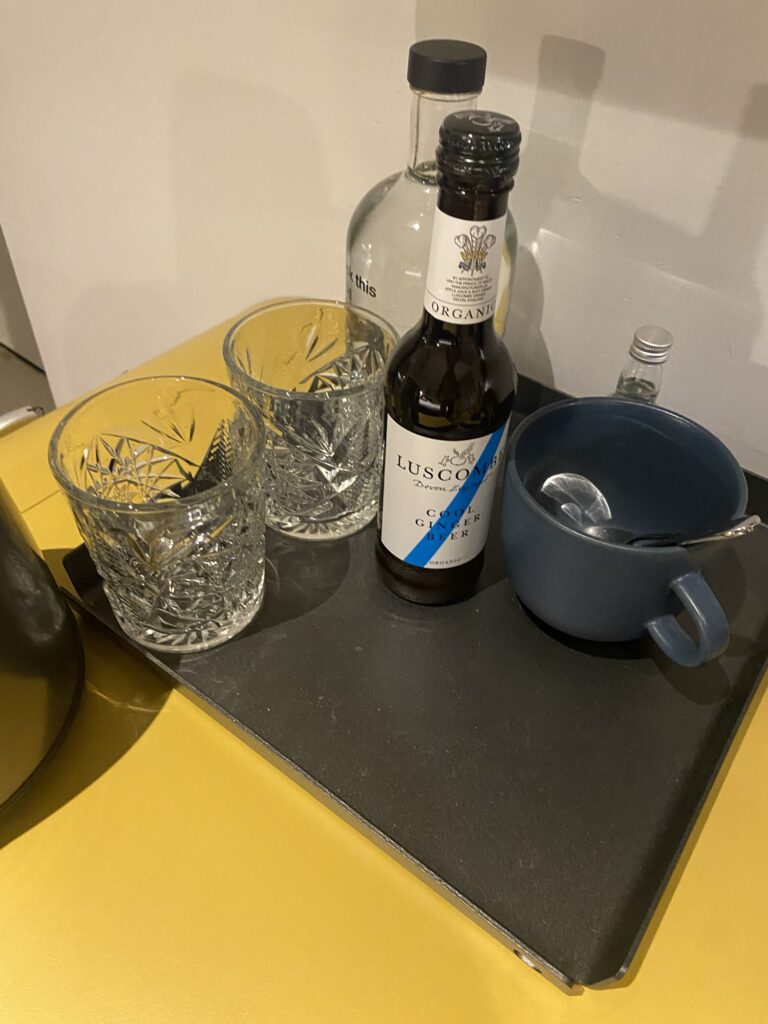 部屋に無料の飲み物(アルコール)、スナックを置いてくれていた。行かなかったけど、夕方にはワインとチーズが食べられる無料のスナックタイムもあるらしい。