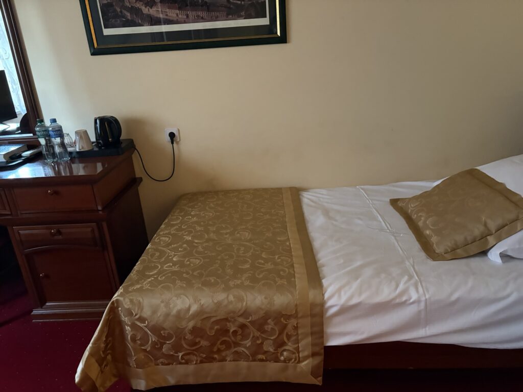 部屋はクラシックな感じで良い。ポットも無料の水もあった。
