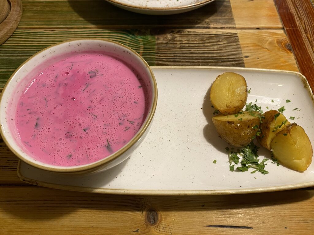 ピンクのスープ、色がすげぇ!シャルティバルシチェイという料理らしい。覚えられない。