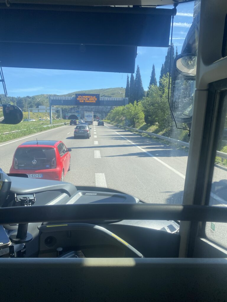 マルセイユ空港から街中までバスで。結構遠い。30km近くあるらしい。ヨーロッパの空港の中では遠め。