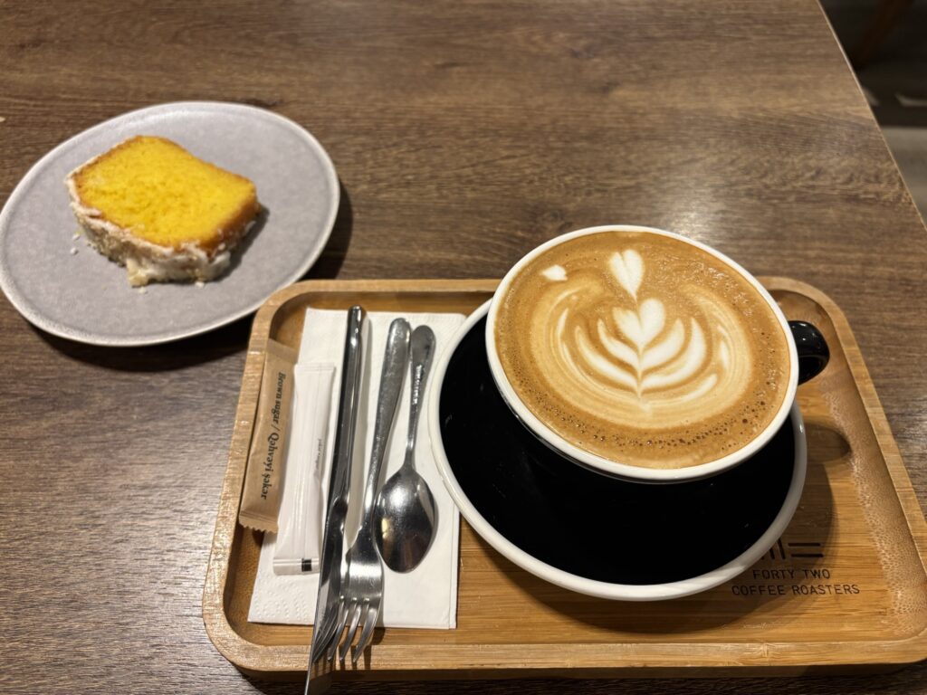普通のカフェだけど、コンセントが多くて作業用に良いと思う。Wi-Fiもあった。