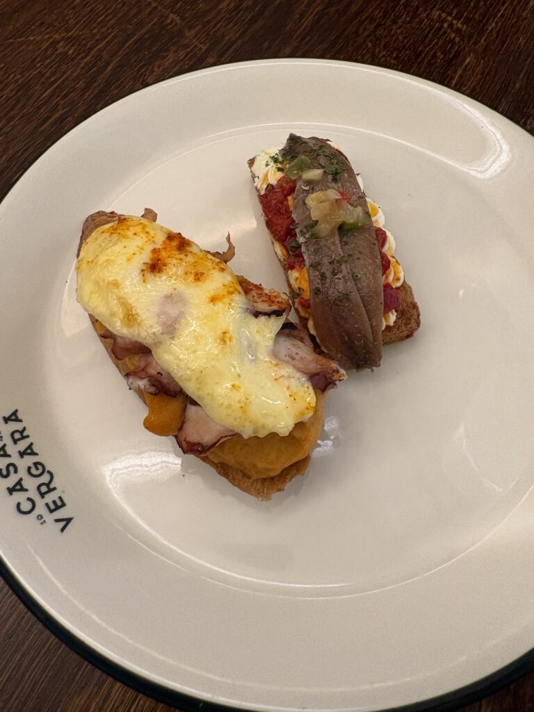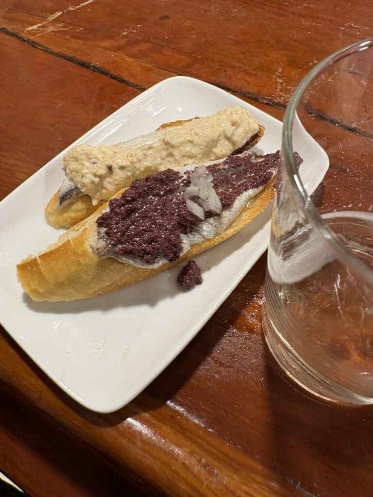 チャコリとアンチョビのピンチョス2つで8.7ユーロ、1,600円くらい。安いなぁ。