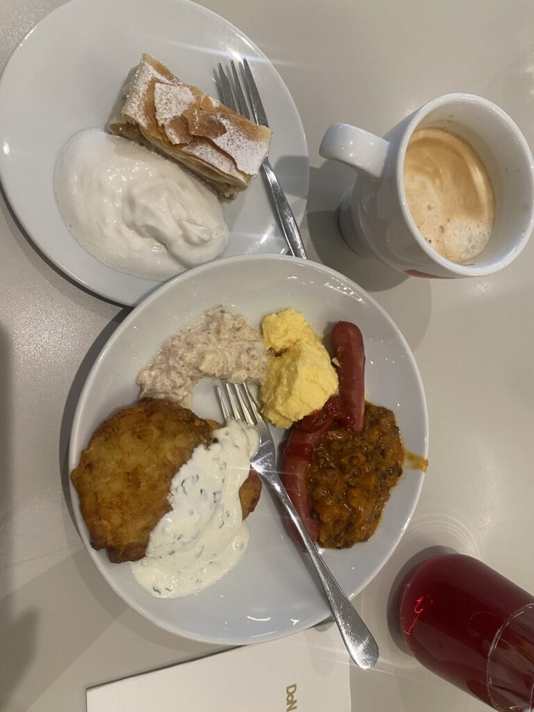 ブダペストからウィーン空港までは早朝の直行バスで。ウィーン空港のラウンジはかなり美味しい。