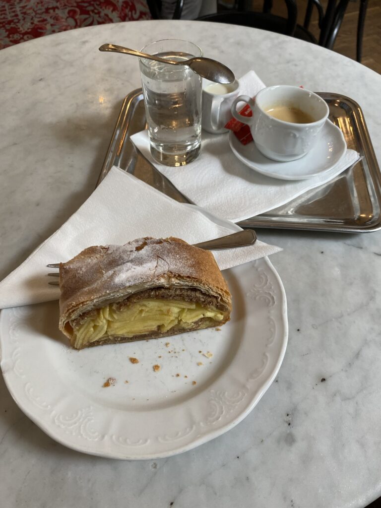 アップルシュトゥルーデルを食べます。うん、うまい!